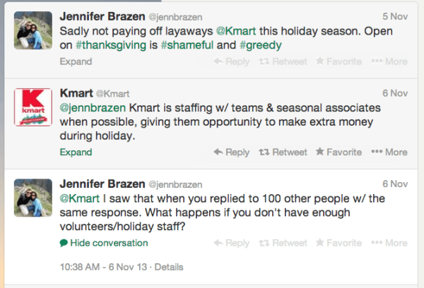 Without implementing such a plan swiftly and confidently, your brand’s responses can dig you into an even deeper hole. Just take it from K-Mart. In 2013, they announced earlier Black Friday hours than ever, and when their customers Tweeted about their shady staffing ethics, their social team wrote one statement and responded with it more than 100 times... Just. No.