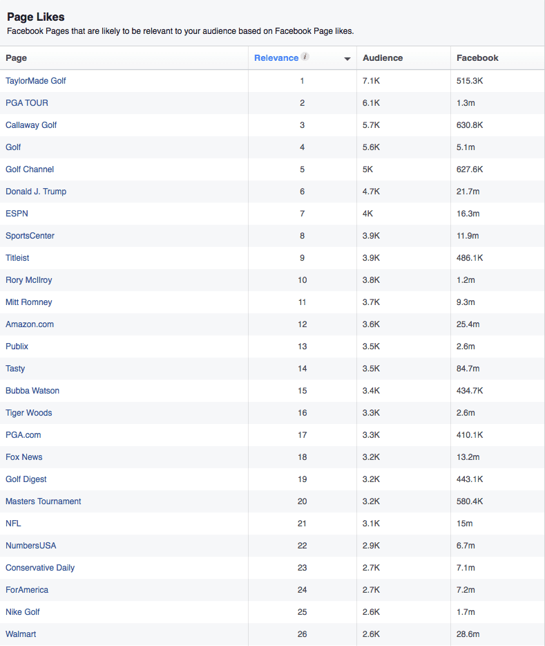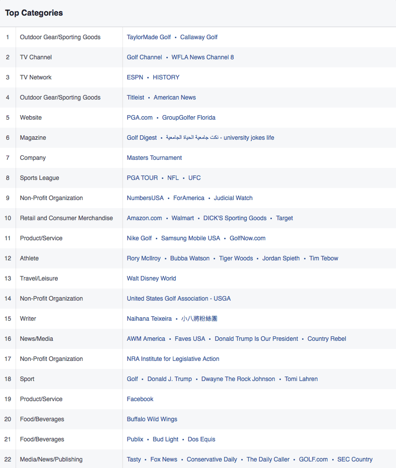 So not only can we see that these users also like Callaway Golf, the Golf Channel, we also know who their favorite athletes are (Rory McIlroy, Bubba Watson, Jordan Spieth, and Tim Tebow) but also that their favorite sport team is the Tampa Bucaneers and their favorite restaurant is Buffalo Wild Wings.