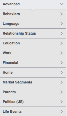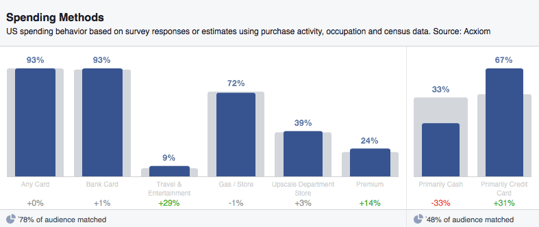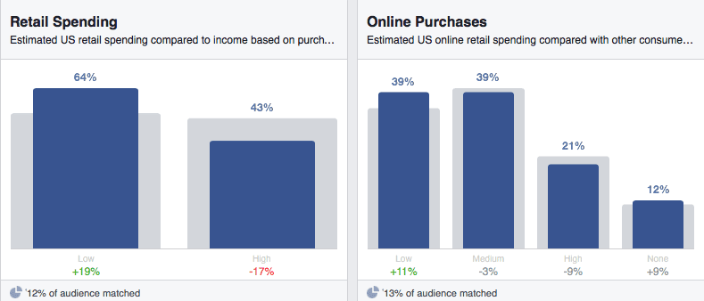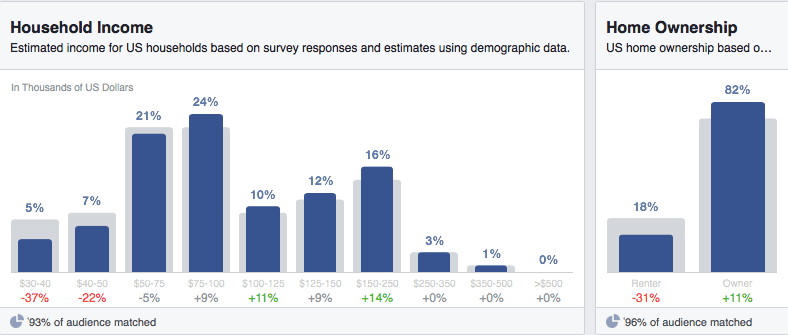 Third-party data partners: Information such as household income, purchasing behavior, and home value is also available through external companies that match that data to Facebook user IDs. It is worth noting this information is only available for U.S. audiences.