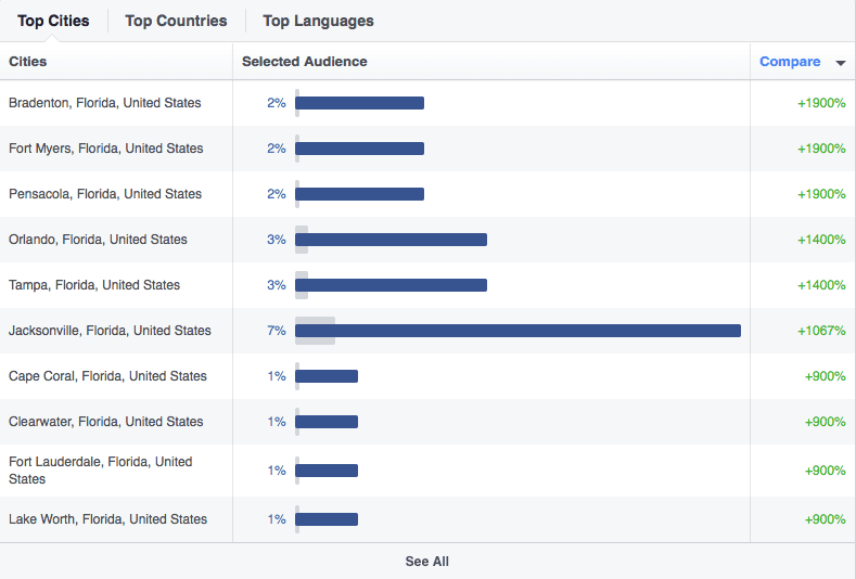 You can also view location information. Since we already filtered to just Florida, we can see the top cities of his target audience. We can now use this to create more targeted advertising as well as data for potential store locations and opportunities for pop-up events or sponsorship of events.