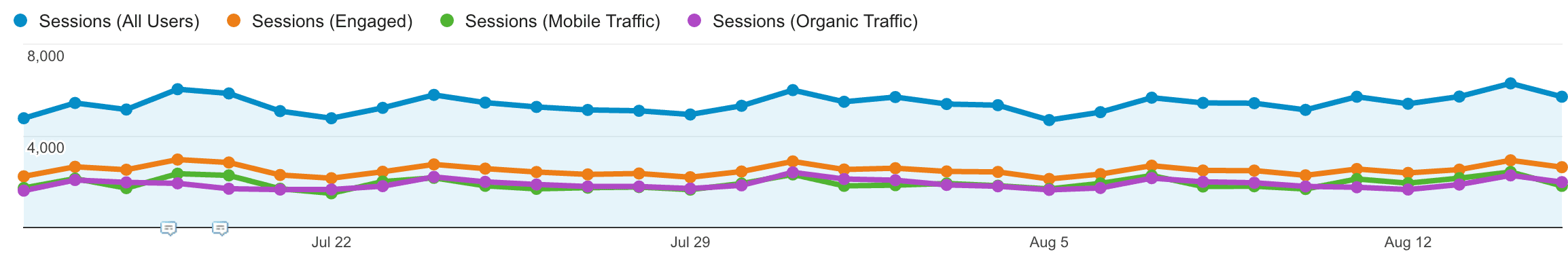 Create a “High Value Traffic” segment that includes anybody who visits high value pages such as a purchase or contact page, anybody who views a high number of pages, anybody that stays on your site for a very long time and anybody who engages deeply with your site. This segment gives you a quick overview of the health of your site.