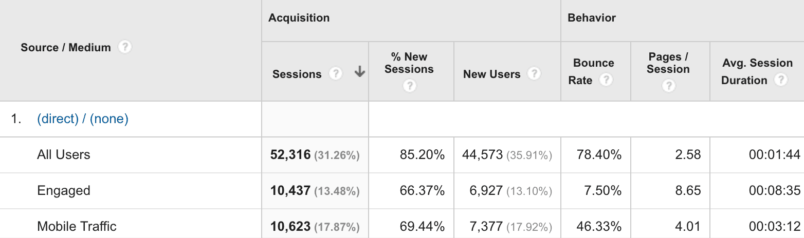 Segmenting your audience is a crucial first step to understanding your traffic and is extremely easy to do. By segmenting your traffic, you are able to obtain averages that are more representative of actual people. Rather than averaging everybody, you can average only the people that behave the same, meaning your averages are closer to representing real human behavior.