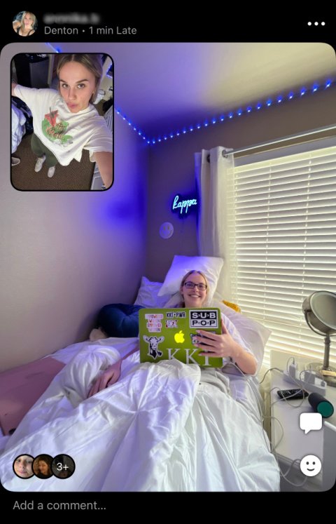 The app is both intimate and mundane, offering snapshots of other people’s days in real time, and as boring as that might sound there is something intriguing about seeing what your friends are up to at a specific given time in the day in an unedited format. Scrolling through my BeReal feed I see friends working at their desks, college students in class, someone eating a sandwich, a friend doing laundry and another reading a book on the couch. There are no filters, no staging, in fact it is the ugliness that is the heart of the app’s appeal. The key ingredient is that you are okay looking shitty in front of a group of people. It is real life taking place grabbed in a quick snapshot and shared with a group of friends.