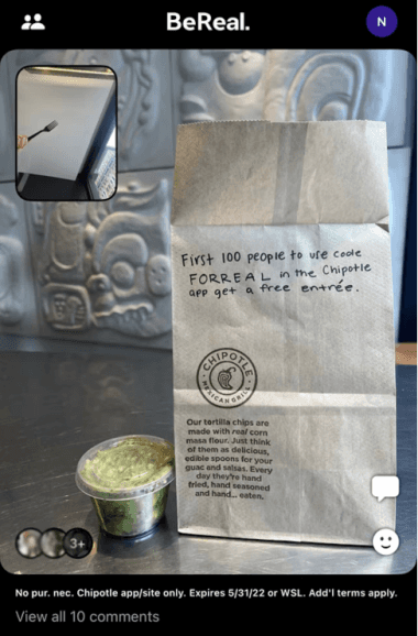 How can brands get involved and ride the wave? Having brands and adverts on the platform goes against BeReal’s code of conduct, and currently there are no paid advertising options. However, being real and candid is key, and with a bit of creativity one might just have the perfect ad. Chipotle did just that! The company was the first brand to create an account and post a discount code giving the first 100 people who used it a free meal. Chipotle’s vice-president for digital marketing said: “We see a massive opportunity to highlight our brand’s transparency in fun ways for our fans on BeReal.” Chipotle has managed to be successful on BeReal because its content feels native and real to the platform.