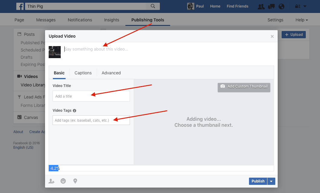 As the video is uploading you will need to fill out all the details about the video including the name of the video and the comment that will go with this video. This is necessary because every piece of content uploaded to Facebook is treated as a post. Although we will be backdating this video, there will technically be a post that is also created which is also backdated. If you would like, this is also where you can upload a custom thumbnail for your video.