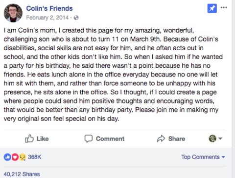 Back in 2014, a Michigan mom created a Facebook page in order to get positive thoughts and birthday wishes for her disabled son who didn’t want to have a birthday party because he thought he didn’t have any friends. She had no clue how the people of the Internet would show up for her son. As of February 2018, Colin’s Friends has 1.8 millions friends.