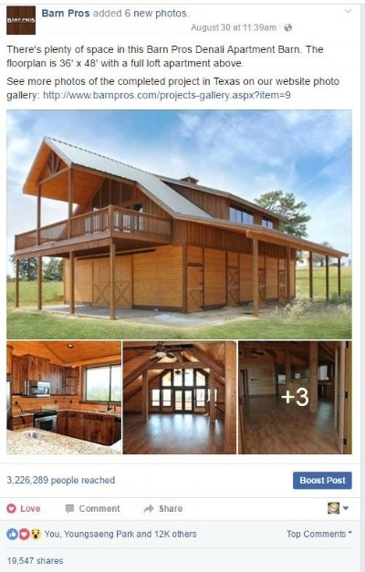 I am lucky to work with Barn Pros, a company based in Washington State that offers pre-engineered barn kits. Their product line includes barns, barns with living quarters, barn homes, shops, garages, arenas and professional equestrian facilities. They have an attractive product, and while they are technically in the engineering and manufacturing space, over the past three years I have positioned their brand on social media as a high-end online retailer. Through consistent attention to Facebook, their social media community has grown to a following of over 166,000 fans who are very engaged with the product and lifestyle presented.