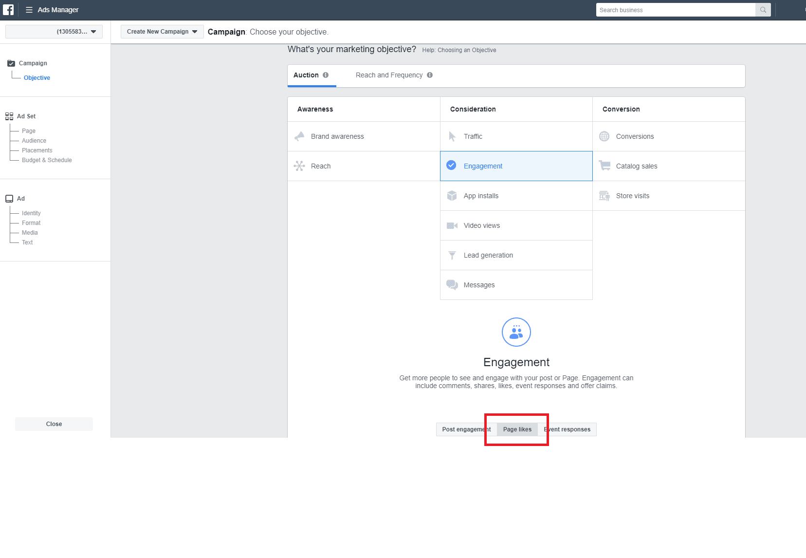 One of the most popular ways to increase page likes when a client lists this growth on their “wish list” is to run a Page Likes campaign. To do this, you can click Promote Page directly on the Facebook Business Page or you can go into Ads Manager and build a campaign through the Engagement Objective.