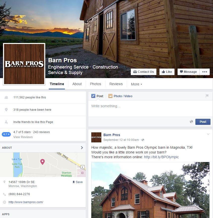 There is no debating the best profile picture size to use is 180 pixels X 180 pixels (square). There is some debate if you should use your business logo or a photo that represents your business. In our example, Barn Pros uses their logo. Their name is short, and they use the brown ranch wood background as a consistent theme throughout their website, so the profile picture logo ties their digital presence together.