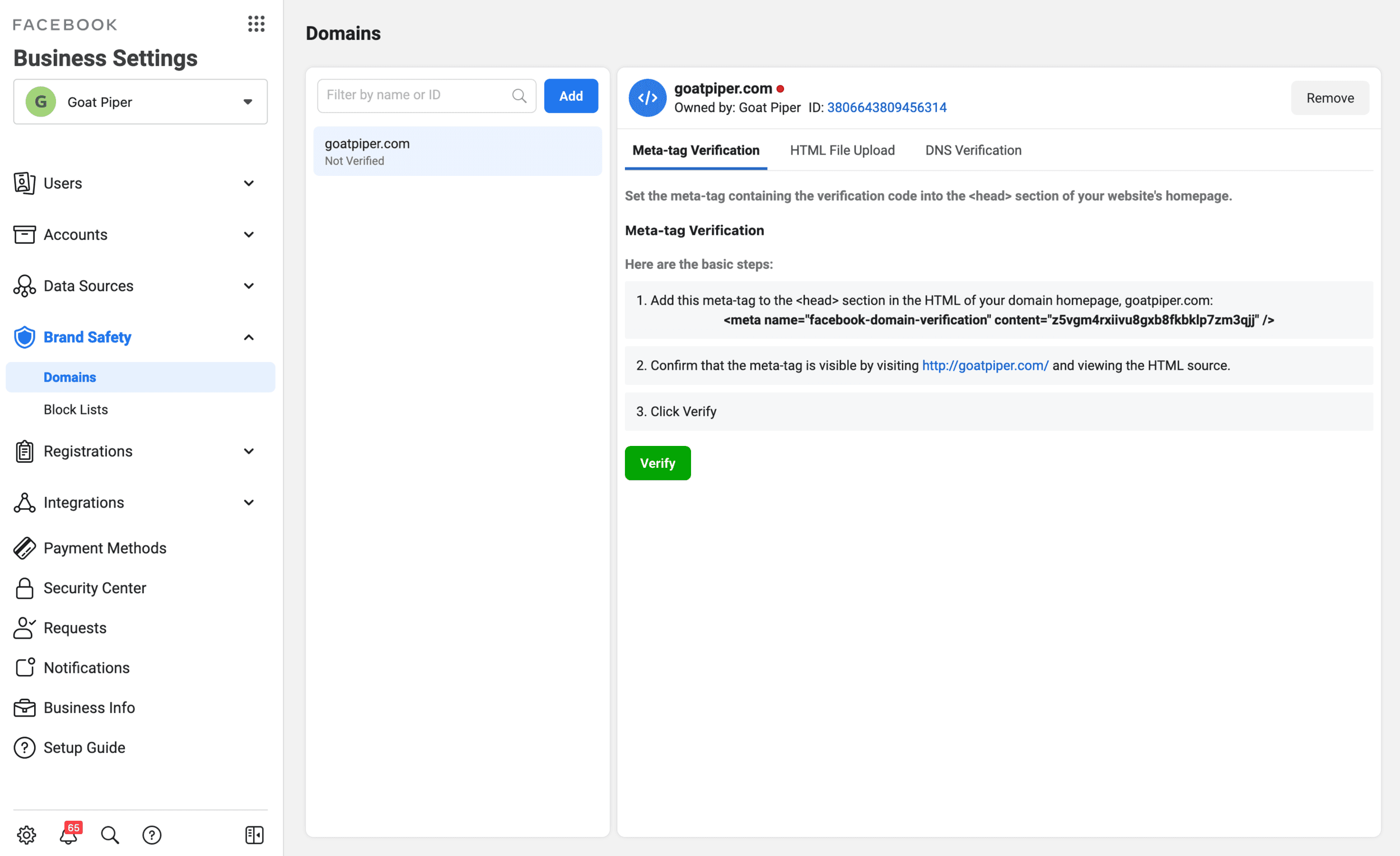 Verifying with a meta-tag will require adding a small snippet of code unique to your website to the <head> section of your domain home page.