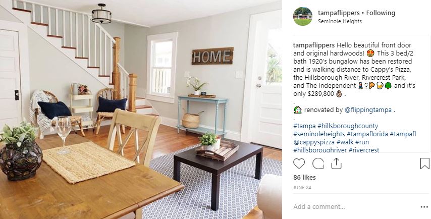 After deciding that I wanted to check out Tampa Bay, FL as a potential city in which to reside, I followed #tampafl on Instagram so I could get a sense of the city since I live two hours away. I then started seeing tons of posts relating to homes being flipped, homes on the market, new restaurant construction, commercial buildings being renovated, etc. In my case, it lead me to follow a local Tampa real estate agent and house-flipper, Keeley Toro of the Lombardo Team. Follow Keeley at @tampaflippers for great real estate content and to see her BEAUTIFUL flips in the Seminole Heights area of Tampa.