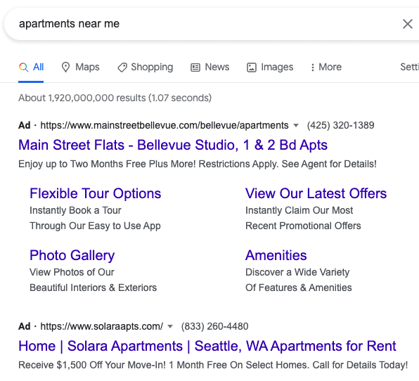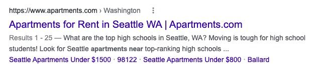 Apartment shoppers might hear about your community on an internet listing service (e.g., Craigslist, For Rent, or Apartment Guide), physical signs, or a resident referral; however, those sources of introduction typically do not provide much information about your community. So, people searching for your community by name are (more likely than not) your warmest leads, and you will want to make absolutely sure that you capture them. For example this potential tenant may search google for, “Community Name in City, State” or “Brand Name Apartments in City”.